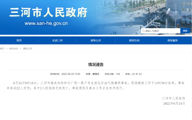 三河市人民政府发布情况通告:6月24日9时18分,三河市福成尚街时代广场一商户发生液化石油气瓶燃爆事故,现场搜救工作于13时30分结束。事故共造成22人受伤,其中2人经抢救无效死亡。事故原因及善后工作正在有序进行。