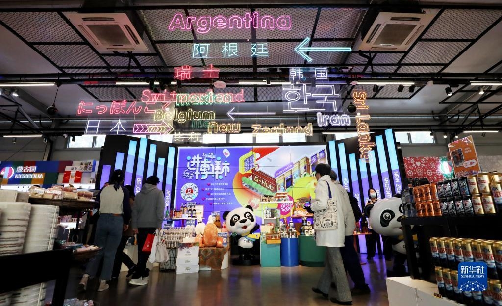 在上海市南京路上的进博集市内,顾客们走在一处各国商品集中展示台前(2021年11月8日摄)。新华社记者 方喆 摄