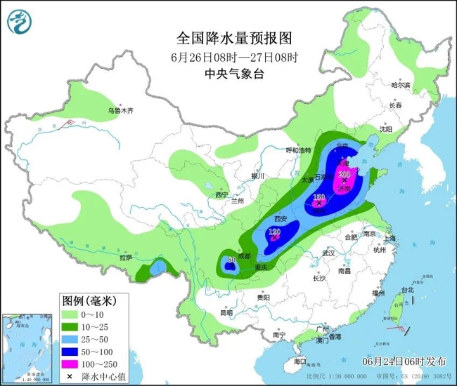 中央气象台预计,6月25日夜间至29日,西北地区东南部、华北东部、东北地区、黄淮、江淮、江汉、江南西部、华南西部及西南地区东部等地有一次大到暴雨过程,局地有大暴雨,并伴有短时强降水、雷暴大风等强对流天气。
