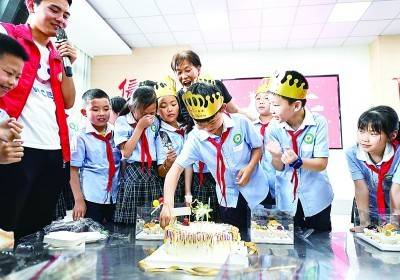 在四川省中江县城西小学西山校区,四川省中江县留守儿童艺术团团长刘春香(后)给孩子们过集体生日。新华社发