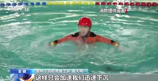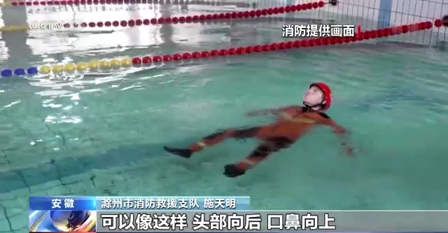 滁州市消防救援支队消防员 施天明:对于不会游泳的人来说,首先要保持冷静,切记不要将手举过头顶拼命挣扎,这样只会加速我们的下沉,造成更大的危险。