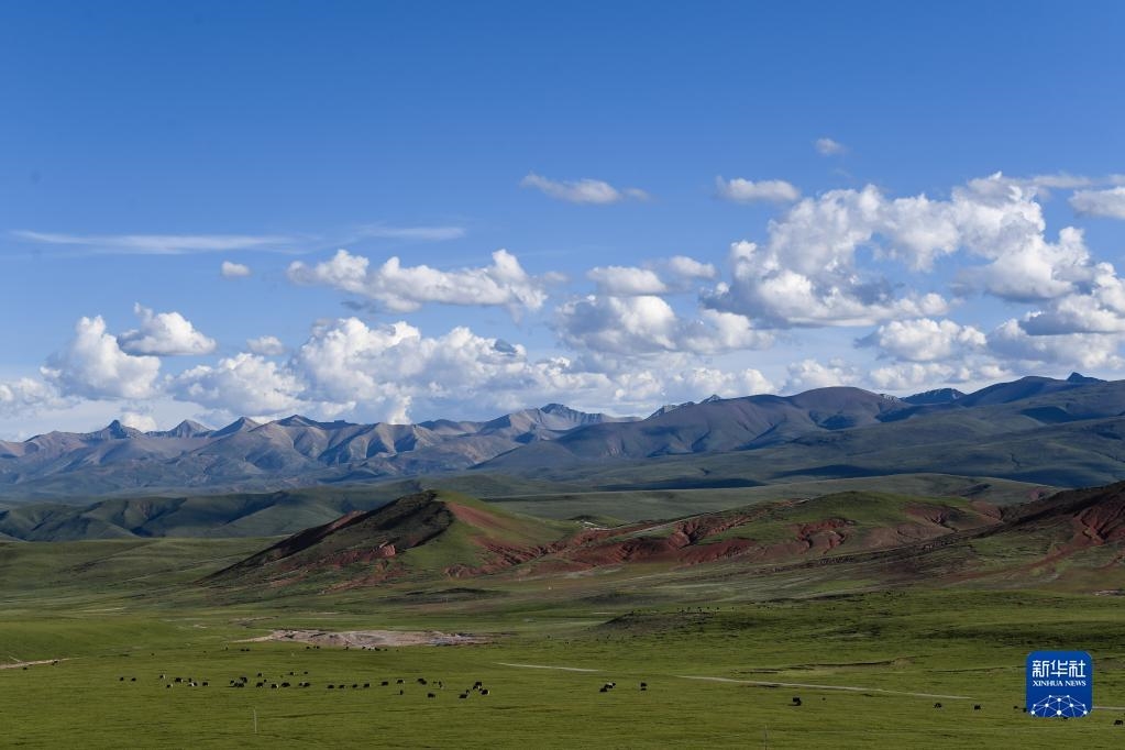 2021年7月23日,在青海省玉树藏族自治州境内的草原上,牦牛在觅食。新华社记者 张龙 摄