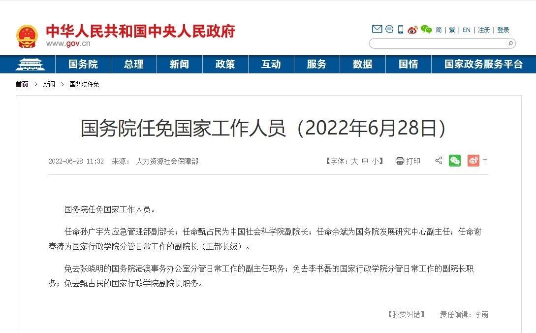免去张晓明的国务院港澳事务办公室分管日常工作的副主任职务;免去李书磊的国家行政学院分管日常工作的副院长职务;免去甄占民的国家行政学院副院长职务。