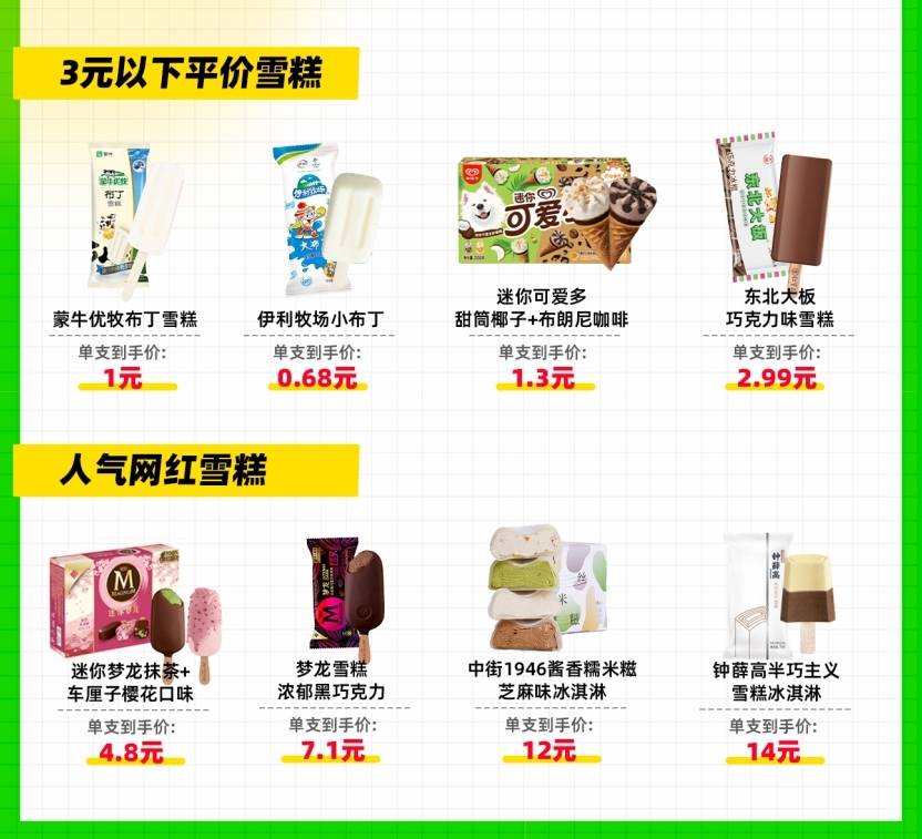 其中,好吃不贵的3元以下雪糕有40多种,价格最低的伊利怀旧口味小布丁,既是当年的味道也是当年的价格,单支折算下来只要0.68元;可爱多甜筒多口味组合套装,折算下来单支价格在1.3元;这两年蹿红的东北大板,外观朴实,奶香醇厚,单支价格为3元。