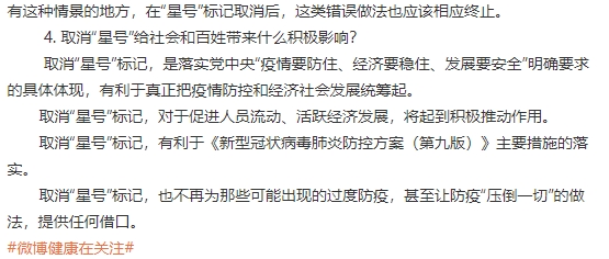 取消“星号”标记,是落实党中央“疫情要防住、经济要稳住、发展要安全”明确要求的具体体现,有利于真正把疫情防控和经济社会发展统筹起。
