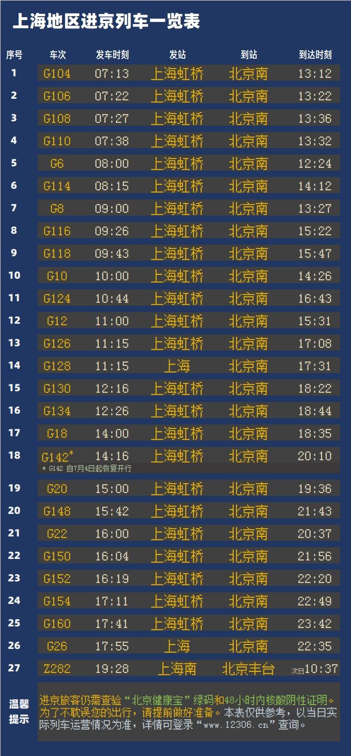 记者从铁路上海站获悉:今日起,上海地区逐步恢复开行进京列车。具体开行列车时刻如下: