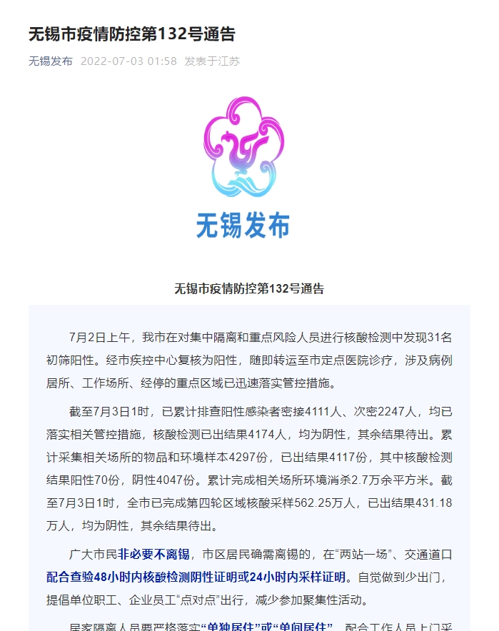 无锡市疫情防控第132号通告