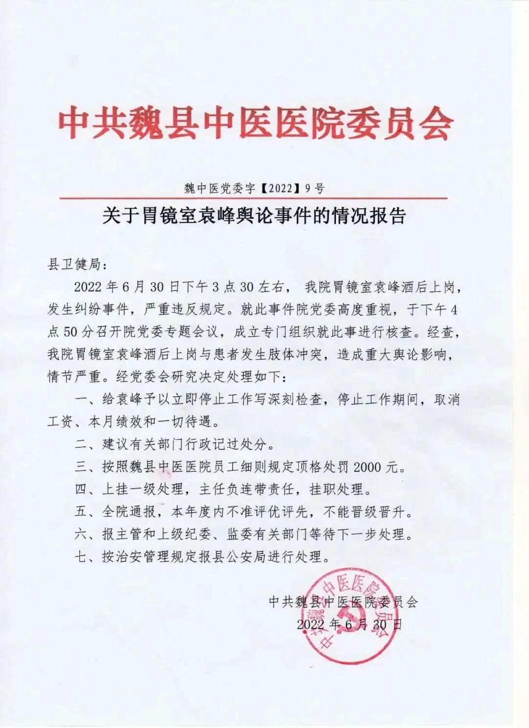 近日,网传河北邯郸魏县中医院一名医生酒后上岗并殴打患者。日前,“魏县中医医院”微信公众号发布公告称,6月30日,胃镜室袁峰酒后上岗与患者发生肢体冲突,严重违反规定,情节严重。经研究决定,给袁峰予以立即停止工作写深刻检查,停止工作期间,取消工资、本月绩效和一切待遇;顶格处罚2000元;本年度内不准评优评先,不能晋级晋升;报纪委、监委和警方进一步处理。