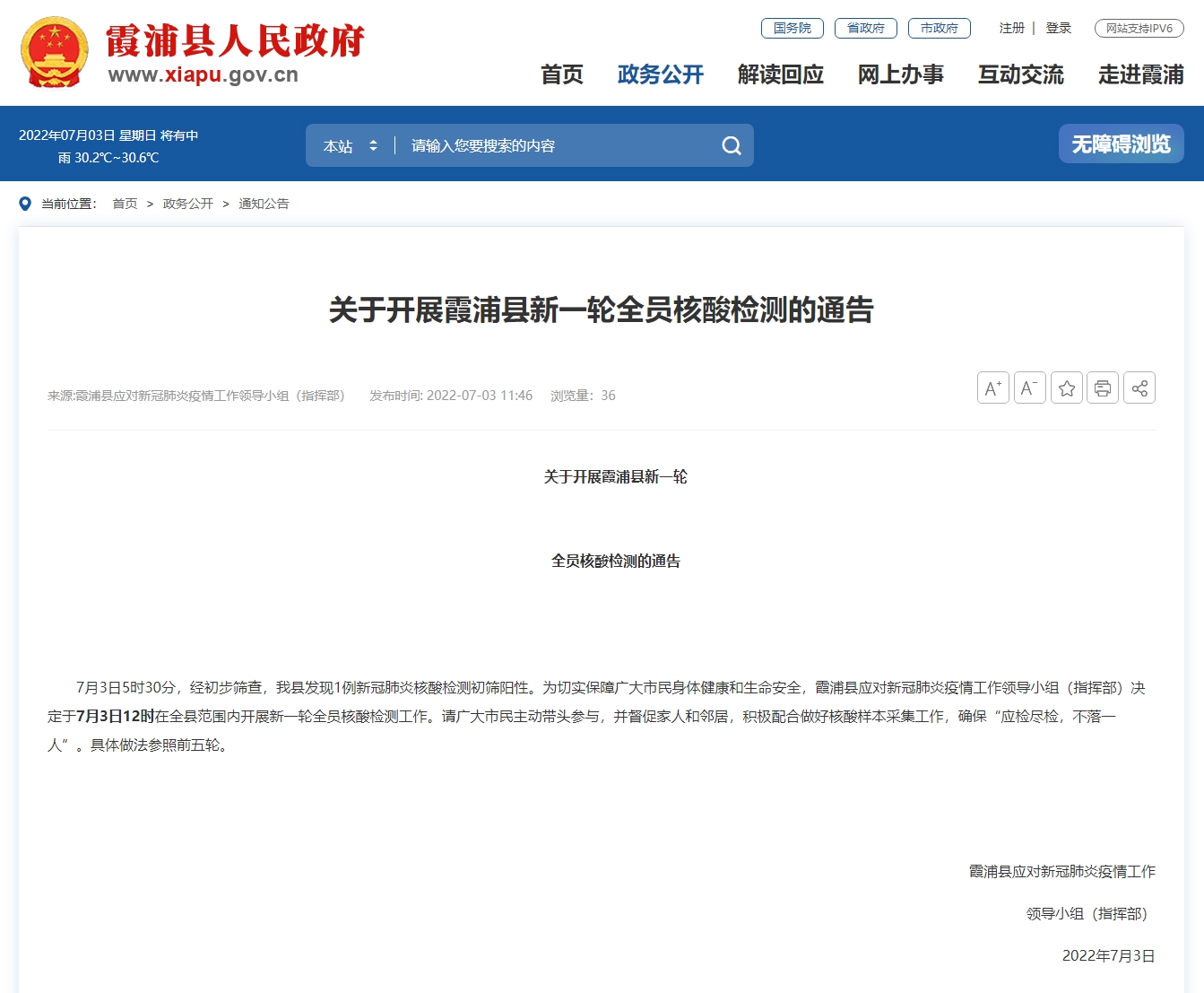 央视网消息:据霞浦县人民政府网站消息,福建省宁德市霞浦县应对新冠肺炎疫情工作领导小组(指挥部)7月3日发布通报, 7月3日5时30分,经初步筛查,霞浦县发现1例新冠肺炎核酸检测初筛阳性。为切实保障广大市民身体健康和生命安全,霞浦县应对新冠肺炎疫情工作领导小组(指挥部)决定于7月3日12时在全县范围内开展新一轮全员核酸检测工作。