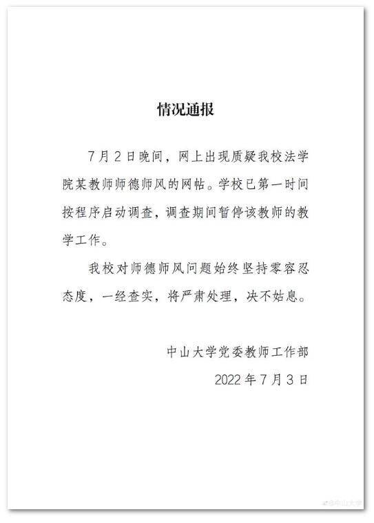 @中山大学 7月3日午间发布情况通报:2日晚间,网上出现质疑我校法学院某教师师德师风的网帖。学校已第一时间按程序启动调查,调查期间暂停该教师的教学工作。