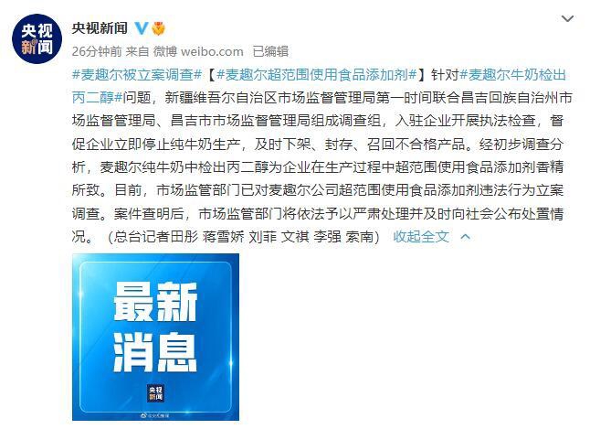 据@央视新闻 微博7月3日消息,针对麦趣尔牛奶检出丙二醇问题,新疆维吾尔自治区市场监督管理局第一时间联合昌吉回族自治州市场监督管理局、昌吉市市场监督管理局组成调查组,入驻企业开展执法检查,督促企业立即停止纯牛奶生产,及时下架、封存、召回不合格产品。