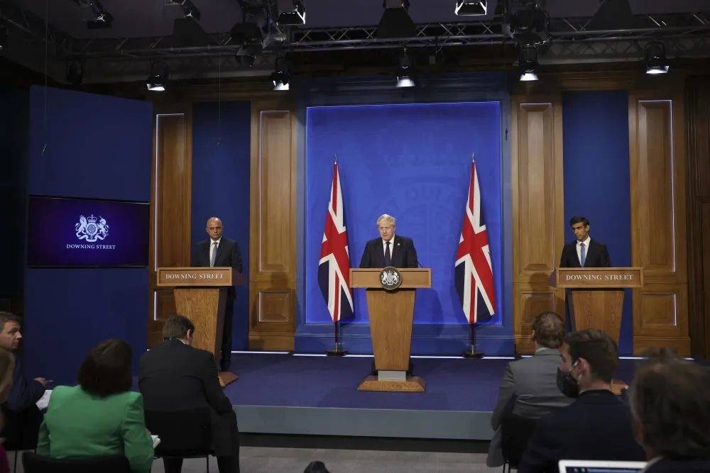 2021年9月7日,英国首相约翰逊(中)和时任卫生大臣贾维德(左)、时任财政大臣苏纳克在伦敦出席新闻发布会。(新华社发,英国首相府供图)