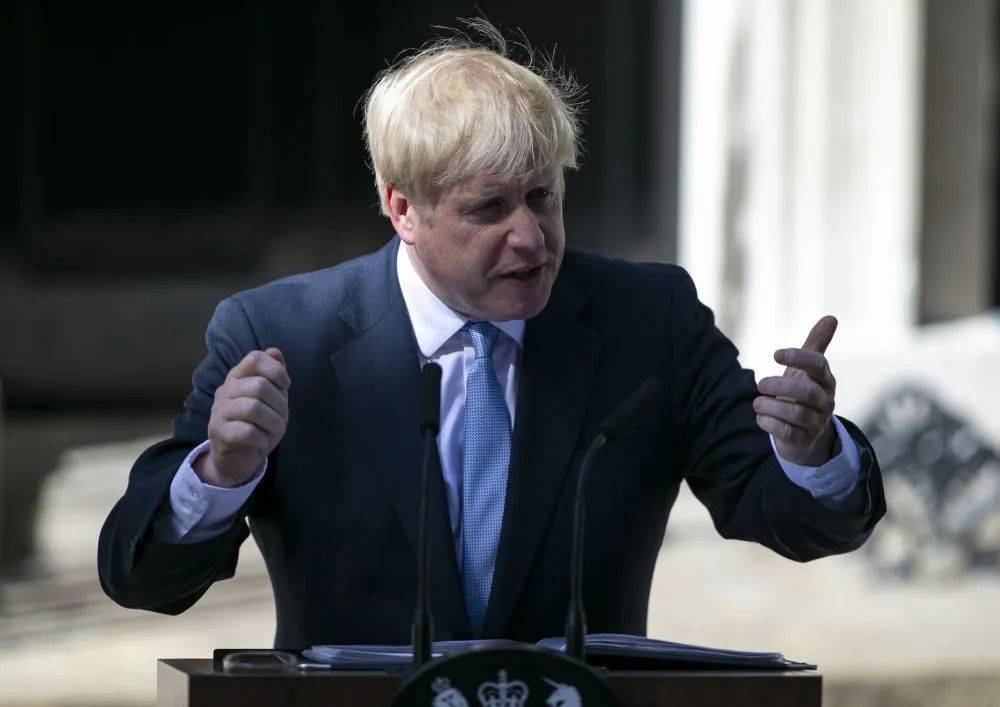 2019年7月24日,英国首相约翰逊上任后在唐宁街10号首相府门前发表讲话。(新华社记者韩岩摄)