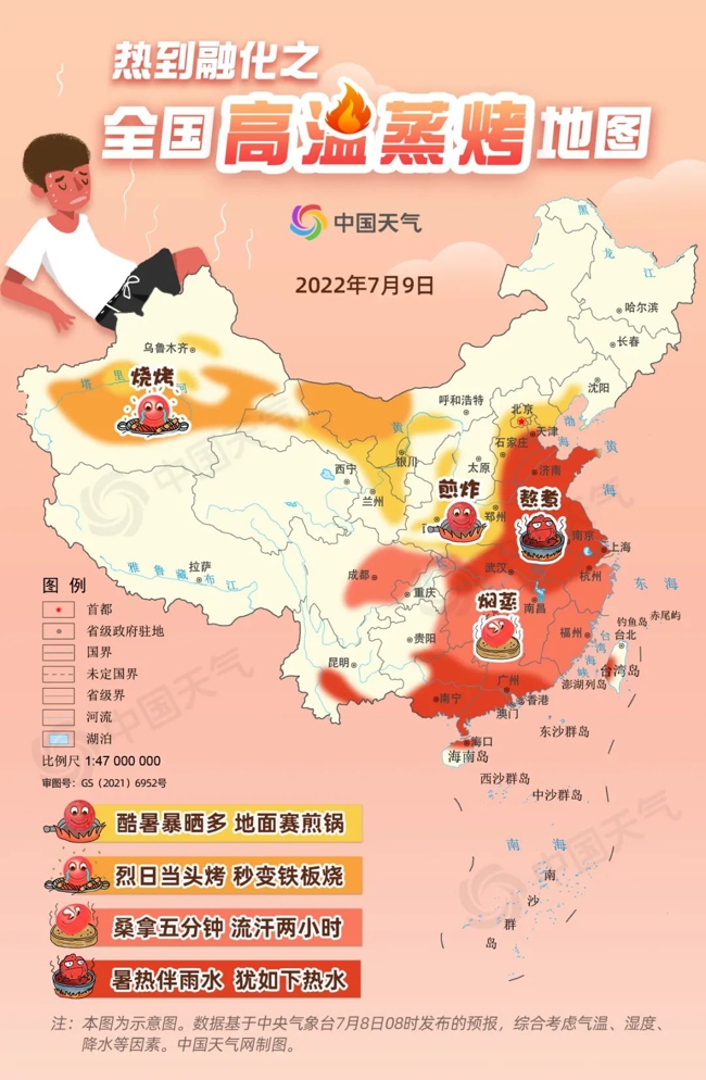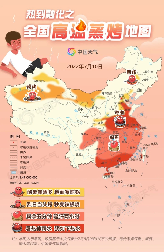 虽然都是热,但各地热得花样百出。有的地方高温炎热,俨然是“晒成煎锅,烤成肉串”;有的地方高温高湿,“闷成蒸笼,热成肉龙”;也有地方雨水与暑热共存,“下雨如同下热水”……从中国天气网推出的全国高温蒸烤地图来看,未来三天,“天气大厨”火力全开,以各种方式“烹饪”着各地的小伙伴。