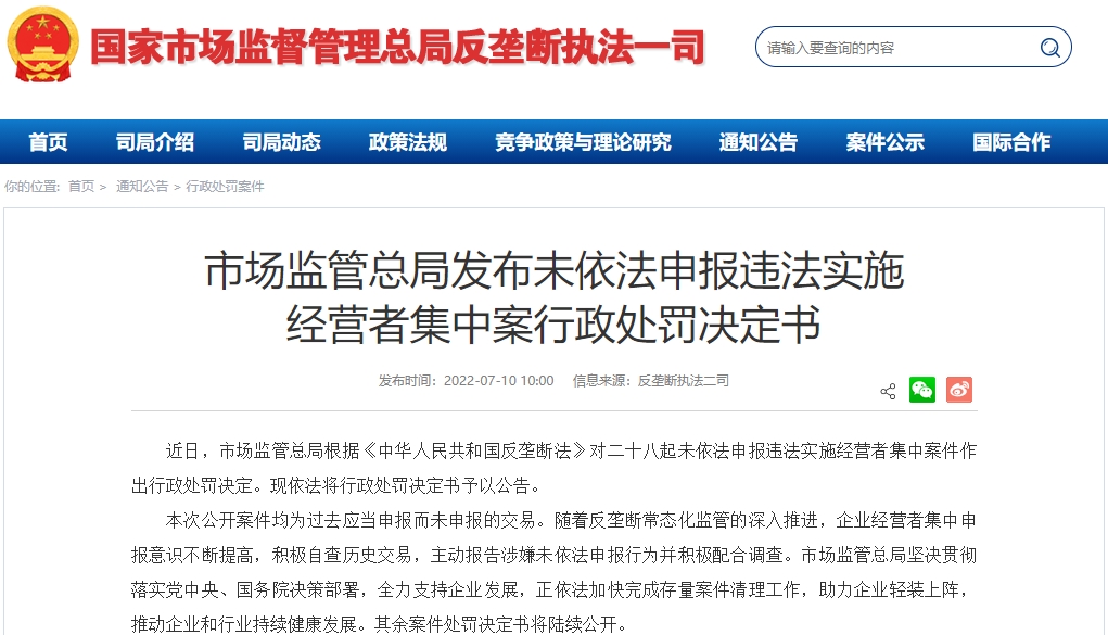 市场监管总局今日(7月10日)公布一批未依法申报违法实施经营者集中案行政处罚决定书。