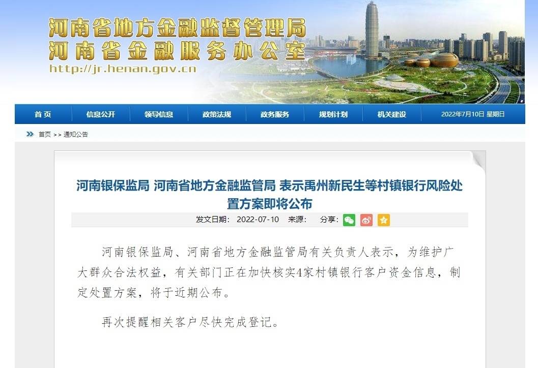 河南银保监局、河南省地方金融监管局有关负责人表示,为维护广大群众合法权益,有关部门正在加快核实4家村镇银行客户资金信息,制定处置方案,将于近期公布。