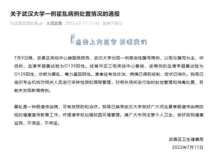 Q1.武昌区卫生健康局发布消息,确认武汉大学出现一例霍乱病例,具体情况是怎样的?
