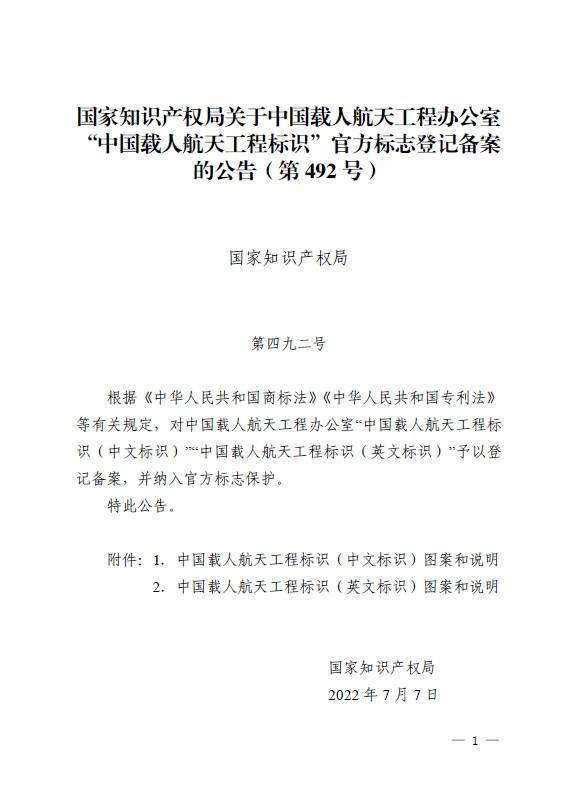 央视网消息:7月11日,国家知识产权局发布《关于中国载人航天工程办公室“中国载人航天工程标识”官方标志登记备案的公告(第492号)》,对中国载人航天工程办公室“中国载人航天工程标识(中文标识)”“中国载人航天工程标识(英文标识)”予以登记备案,并纳入官方标志保护。