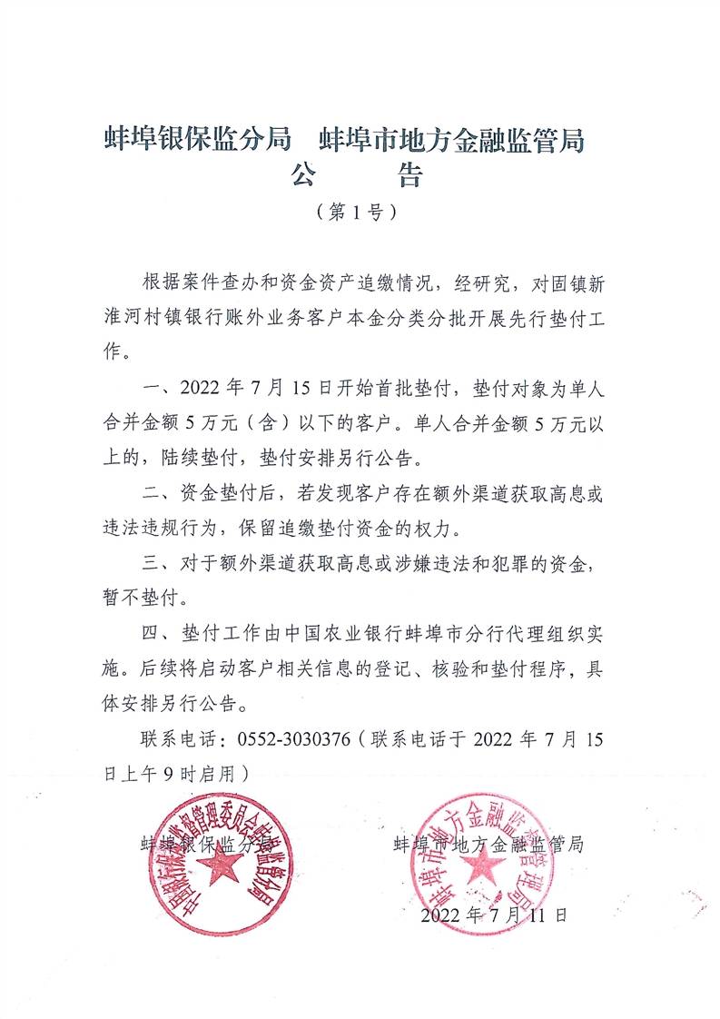 7月11日,安徽省蚌埠市地方金融监督管理局发布公告。根据案件查办和资金资产追缴情况,经研究,对固镇新淮河村镇银行账外业务客户本金分类分批开展先行垫付工作。2022年7月15日开始首批垫付,垫付对象为单人合并金额5万元(含)以下的客户。单人合并金额5万元以上的,陆续垫付,垫付安排另行公告。