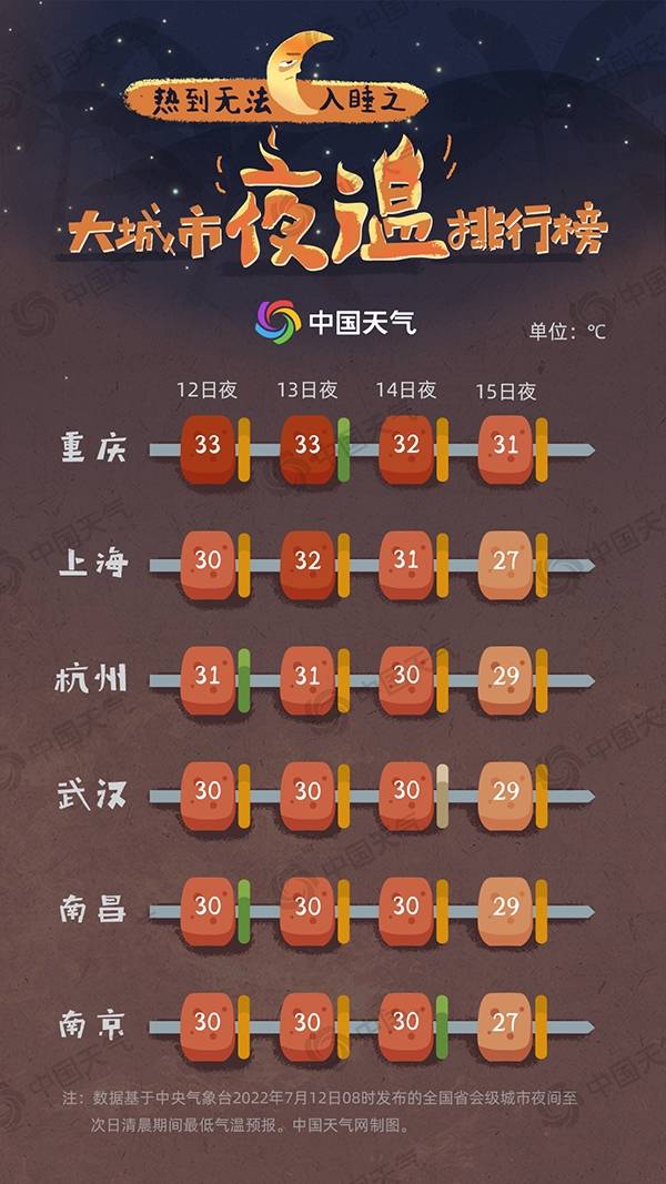 中国天气网盘点了15日前大城市夜温排行,重庆以四天30℃+的热度占据榜首位置,昨日和今日两晚33℃的最低气温,更是热得罕见,这一温度或将打破当地有观测史以来最高夜温纪录。