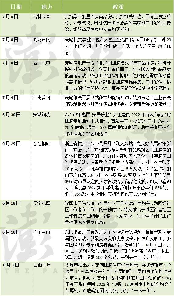 以吉林长春为例,今年7月8日,吉林省长春市政府办公厅发布《进一步促进房地产市场平稳发展若干措施的通知》,《通知》提到,支持集中批量购买商品房。支持机关单位、国有企事业单位、大专院校、科研院所和社会群体与房地产开发企业接洽,组织商品房集中批量购买活动。团购房需取得商品房预售许可,房地产开发企业不得低于成本价格销售。