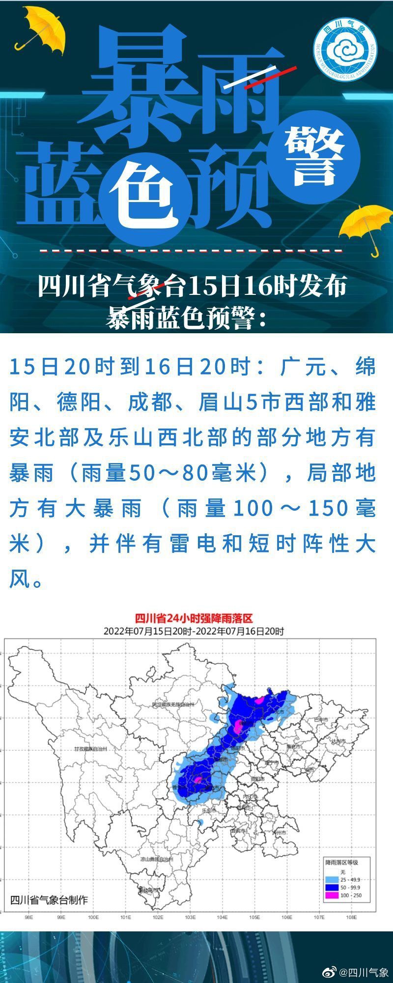 四川省气象台15日16时发布暴雨蓝色预警: