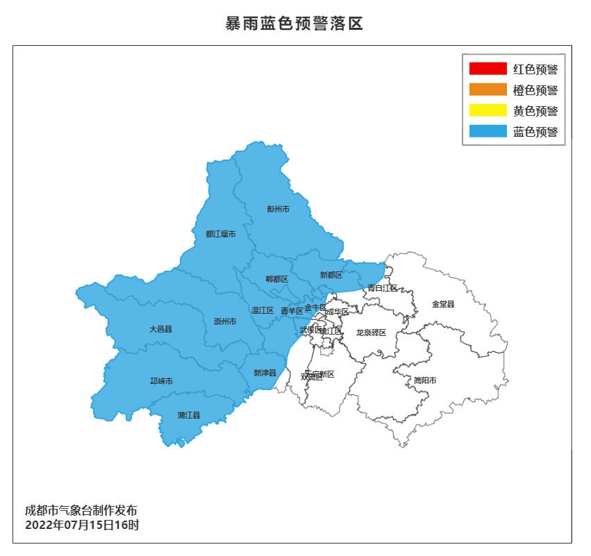 成都市气象台2022年07月15日16时00分发布暴雨蓝色预警:预计今天晚上到明天白天我市有一次明显的阵雨或雷雨天气过程,其中都江堰、彭州、崇州、大邑、邛崃、蒲江、温江、郫都、新津、双流和新都的部分地方有暴雨,主城区和青白江的局部地方有暴雨,个别地方累计雨量可达120毫米以上,雷雨时伴有短时阵性大风。请注意防范暴雨、雷电和大风带来的不利影响。