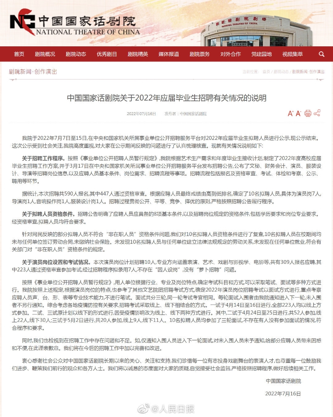 中国国家话剧院发布关于2022年应届毕业生招聘有关情况的说明:我院于2022年7月7日至15日,在中央和国家机关所属事业单位公开招聘服务平台对2022年应届毕业生拟聘人员进行公示,现公示结束。这次公示受到社会关注,我院高度重视,对大家在公示期间反映的问题进行了认真梳理核查。现就有关情况说明如下: