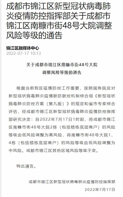 根据当前我区疫情防控工作需要,按照国务院应对新型冠状病毒肺炎疫情联防联控机制综合组《新型冠状病毒肺炎防控方案(第九版)》的规定和省市专家综合评估,经成都市锦江区新型冠状病毒肺炎疫情防控指挥部研究决定:自2022年7月17日1时起,将成都市锦江区南糠市街48号大院2栋(包括楼栋底层商户)的风险等级由低风险调整为高风险,将南糠市街48号大院1、4栋(包括楼栋底层商户)的风险等级由低风险调整为中风险。成都市锦江区其他区域风险等级不变。