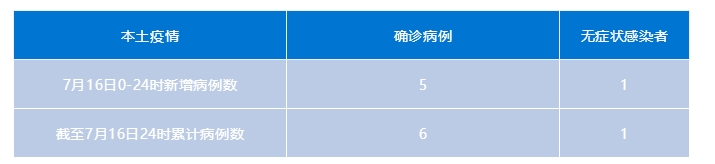 7月16日0-24时,我市新增本土确诊病例5例,新增1例本土无症状感染者。截至7月16日24时,我市本轮疫情累计报告本土确诊病例6例,本土无症状感染者1例。