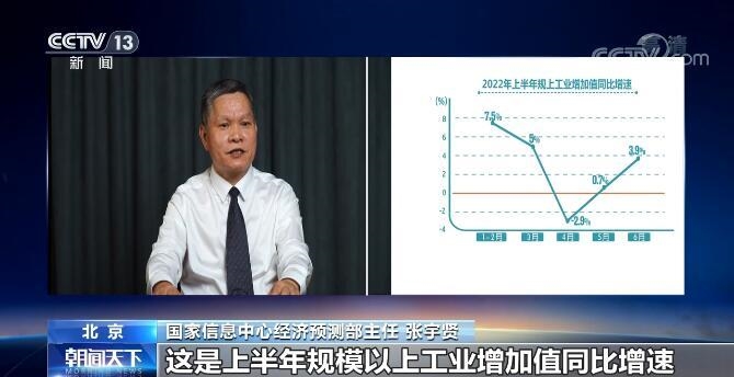 国家信息中心经济预测部主任 张宇贤:这是上半年规模以上工业增加值同比增速,受疫情影响,3月略有下降,4月大幅下挫。随着国内疫情防控形势总体向好,重点产业链供应链有序恢复,工业生产稳步复苏。5月份已经企稳回升,6月明显反弹,同比增长3.9%。