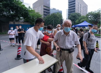 "大爷慢点,走这边专用通道。"远远看着一位头发花白、拄着拐杖的老大爷向核酸检测点走来,志愿者连忙迎上去,搀扶着他走专用通道快速完成了核酸检测。"虽然这会儿已经是傍晚,但是天气依然很热,我们尽量让老年人减少在户外停留的时间,以确保他们的健康安全。"锦官驿街道办事处相关负责人向记者介绍道。