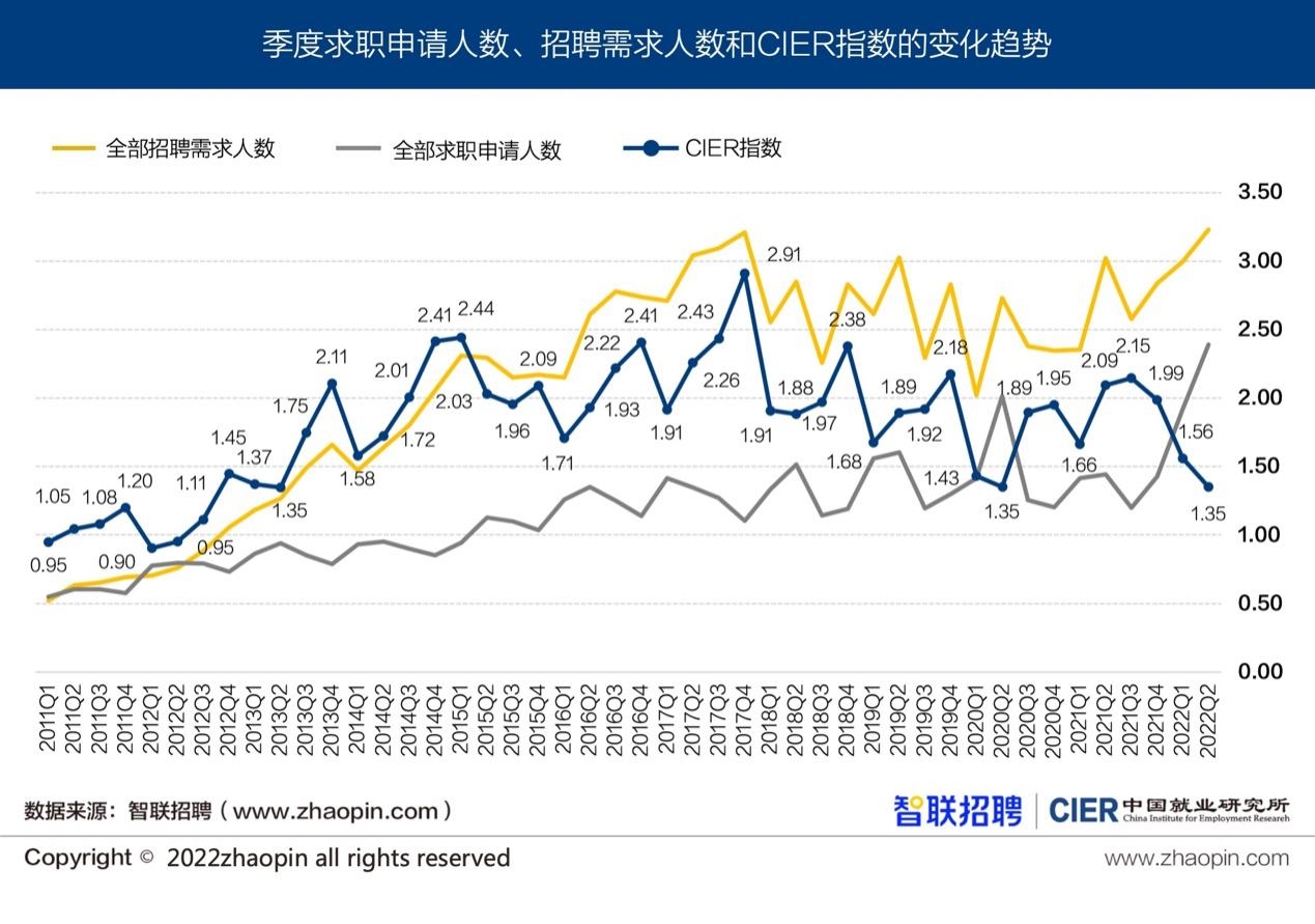 据看度记者了解,2022年二季度全部求职申请人数增速高于全部招聘需求人数,CIER指数从一季度的1.56下降至1.35。同比方面,全部求职申请人数增速也高于全部招聘需求人数,CIER指数低于去年同期的2.09,与2020年同期水平持平。从月度指标来看,4月CIER指数为1.44,5月下降至1.27,6月全国疫情防控形势好转,全部招聘需求人数上升,CIER指数回升至1.35。基于计量模型预测显示,2022年三季度CIER指数的周期成分将略低于二季度,趋势成分也将略低于二季度,季度因素则将明显高于二季度。综合来看,由于季节因素的作用,2022年三季度CIER指数料将高于2022年二季度。