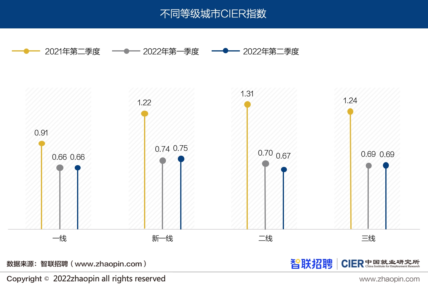 分地区和城市来看,本季度一线、新一线、二线和三线等城市CIER指数均低于1,就业市场竞争激烈。其中,一线城市CIER指数最低,为0.66,新一线城市为0.75,二线和三线等城市CIER指数分别为0.67、0.69。