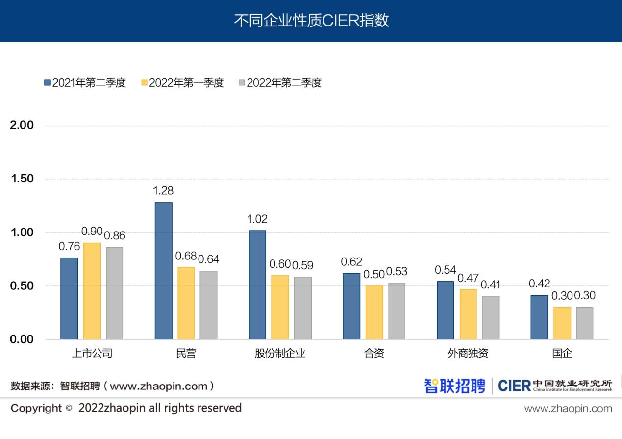 合资企业招聘需求人数增幅最高,较上季度增长9.6%,大于求职申请人数增幅4.11%,带动CIER指数略上升;民营、股份制企业招聘需求也分别上升5.29%、7.41%,但由于增幅小于求职人数,CIER指数则下降;上市公司、外资企业招聘需求人数分别减少0.95%、10.06%,CIER指数也下降;国企的供求和CIER指数变动较小。同比来看,上市公司招聘需求人数增幅最高,达到80.87%,且大于求职申请人数增幅59.97%,CIER指数上升;股份制、合资、外资、国企招聘需求也上升,但求职申请人数增幅更大,CIER指数下降;民营企业招聘需求人数则下降11.64%,CIER指数也下降。(图片由智联招聘提供)