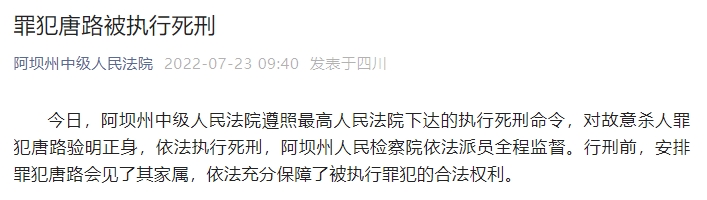 今日(23日),四川阿坝州中级人民法院遵照最高人民法院下达的执行死刑命令,对故意杀人罪犯唐路验明正身,依法执行死刑,阿坝州人民检察院依法派员全程监督。行刑前,安排罪犯唐路会见了其家属,依法充分保障了被执行罪犯的合法权利。
