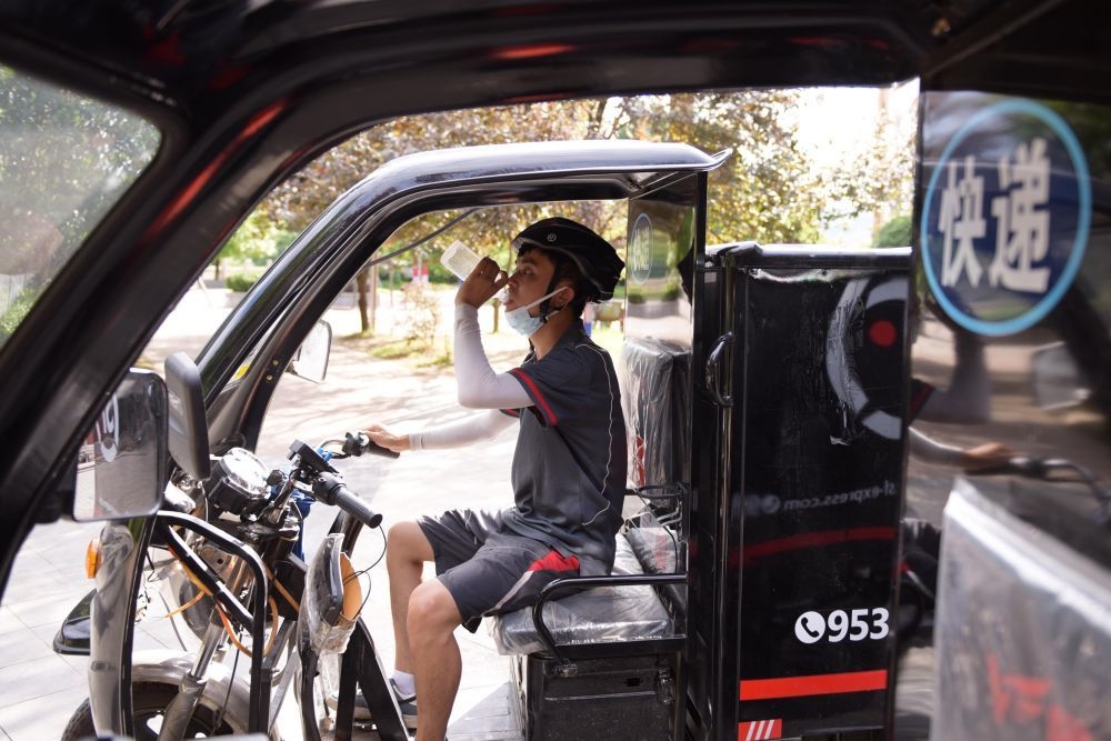 2022年7月12日,在贵州省黔东南苗族侗族自治州岑巩县城区,快递员在工作间隙喝水。 新华社发