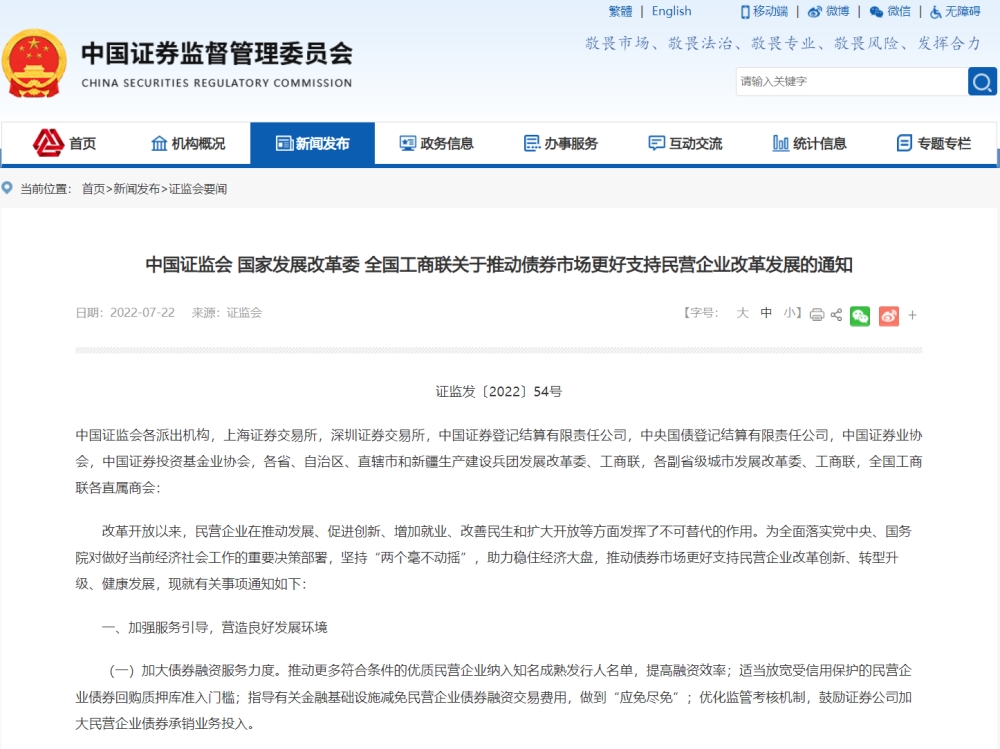 证监会7月22日宣布,近日证监会与国家发展改革委、全国工商联联合发布了《关于推动债券市场更好支持民营企业改革发展的通知》,旨在通过加强金融服务引导、市场监管规范和部门沟通协作等方式增强债券市场服务民营企业改革发展质效。