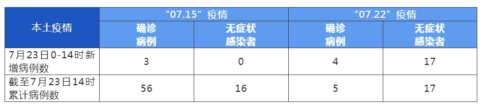 “07.22”疫情新增本土确诊病例4例,新增本土无症状感染者17例,截至23日14时,本起疫情累计报告本土确诊病例5例,本土无症状感染者17例。