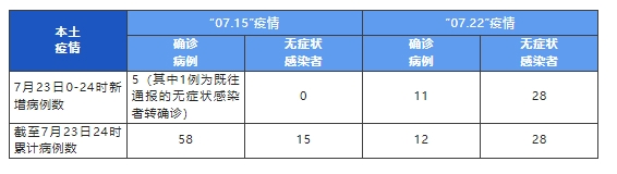 “07.15”疫情新增本土确诊病例5例(其中1例为既往通报的无症状感染者转确诊),无新增本土无症状感染者,截至23日24时,本起疫情累计报告本土确诊病例58例,本土无症状感染者15例。