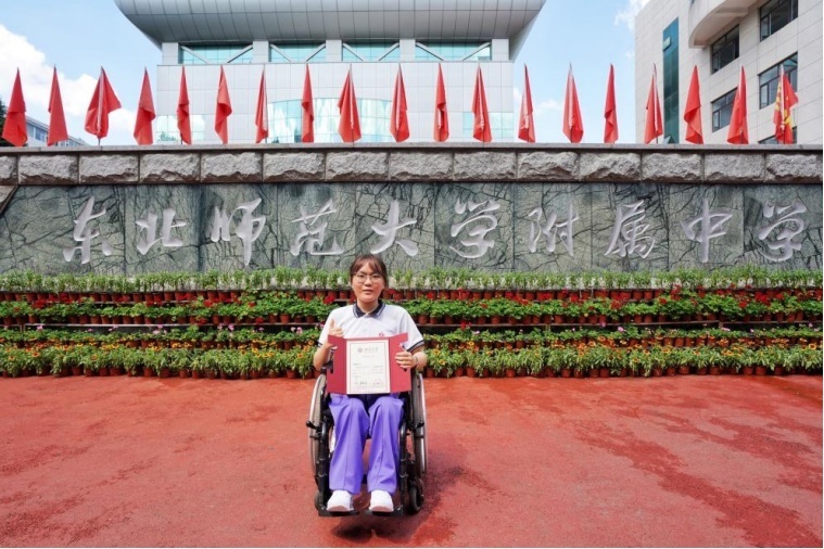 在王馨瑶就读的东北师大附中校园里,有一座教学楼有几个台阶,学校特意为她修了个坡道。为了方便她午休,学校在教室旁为她安排了一个休息房间。王馨瑶去上选修课或走班的课时,都有热心的同学帮忙。