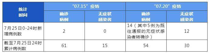 “07.20”疫情新增本土确诊病例14例(其中5例为既往通报的无症状感染者转确诊),新增本土无症状感染者12例。截至25日24时,本起疫情累计报告本土确诊病例54例,本土无症状感染者30例。