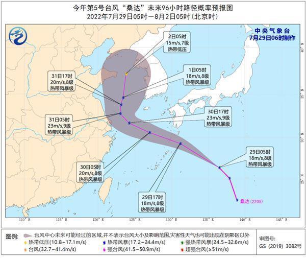 预计,“桑达”将以每小时40—50公里的速度向西偏北方向快速移动,强度变化不大,将于29日夜间移入东海海域,30日夜间逐渐转向偏北方向移动,之后强度逐渐减弱。7月29日—8月1日,我国东海北部、黄海南部有6—8级大风,台风中心经过的附近海面有9级、阵风10级大风。