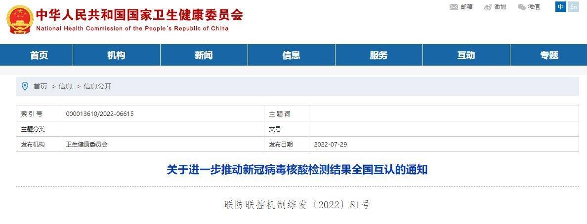 卫健委网站7月29日消息,国家卫健委发布关于进一步推动新冠病毒核酸检测结果全国互认的通知。