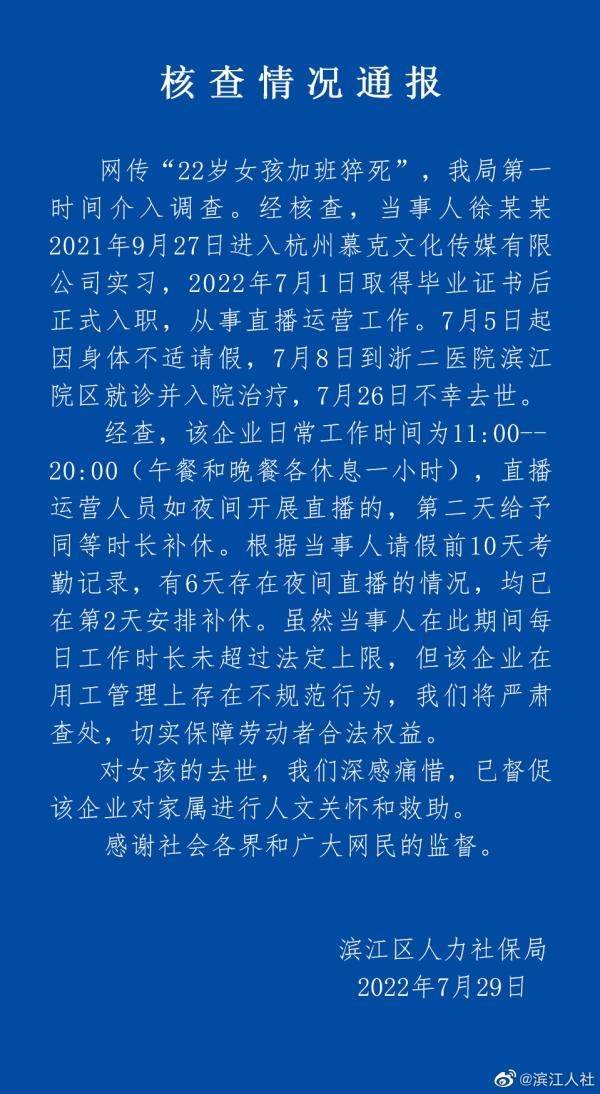 杭州通报“22岁女孩加班猝死”核查情况:企业在用工管理上存在不规范行为