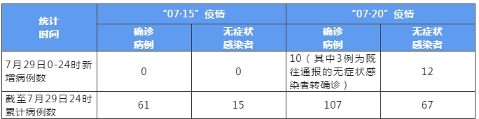 “07·15”疫情无新增本土确诊病例,无新增本土无症状感染者。截至29日24时,本起疫情累计报告本土确诊病例61例,本土无症状感染者15例。