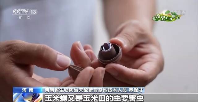 河南省生物防治天敌繁育基地技术人员 乔保才:这个小球里装的是赤眼蜂的寄生卵,它是玉米螟的天敌。玉米螟又是玉米田的主要害虫,它到田间之后,能够主动寻找玉米螟的卵块进行寄生,把玉米螟消灭在卵期、萌芽状态,不能让它长成虫子危害庄稼。