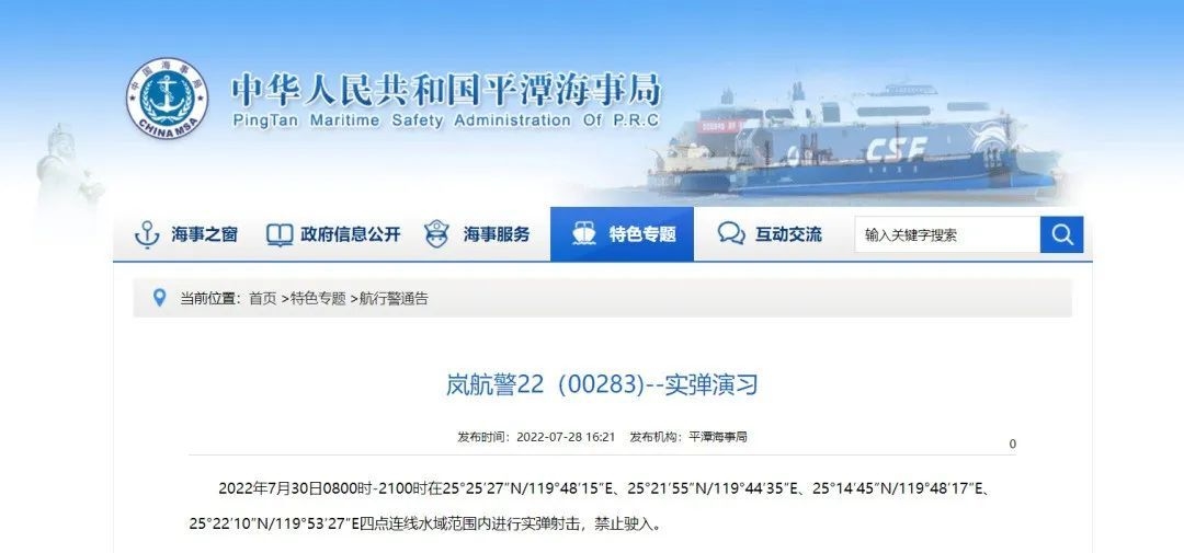 平潭海事局发布航行警告