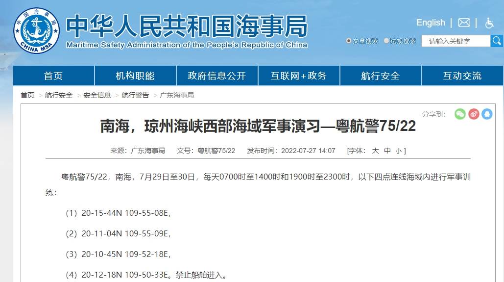 广东海事局发布航行警告