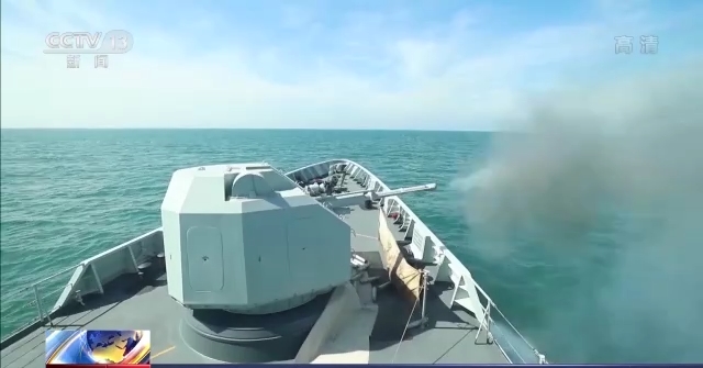 襄阳舰、宜春舰主炮依次开火,一枚枚炮弹直扑海面目标,实施精准打击。